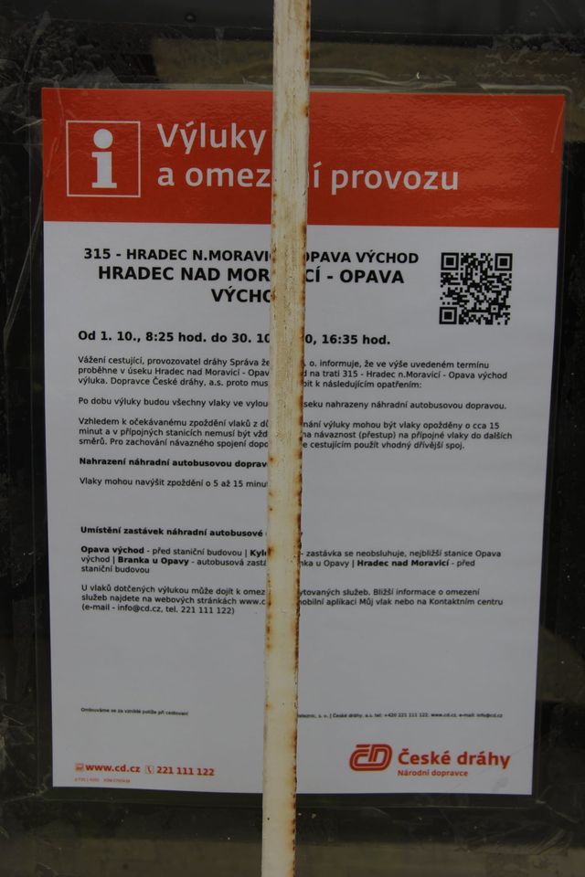 Nákladní bagry jezdí ve stanici poměrně vysokou rychlostí a snadno může dojít k úrazu. Současně vyzýváme všechny řidiče, aby neparkovali v blízkosti nádraží, parkování zde je povoleno pouze zaměstnancům Hroší stavby Morava a.s., Správy železnic a autobusům ČD a ČSAD Vsetín. V současné době dochází k demolici původního nástupiště a severní nákladové rampy, dbejte proto ve zvýšené míře na Vaši bezpečnost a buďte opatrní. Ve dnech 1. 10. - 30. 10. je zavedena náhradní autobusová doprava. Náhradní zastávka v železniční stanici je zřízena před budovou nádraží ze strany od ulice Opavská. Výstavba očekávaného přechodu pro pěší bude zahájena dne 14. 10. 2020. Děkujeme Vám za pochopení!